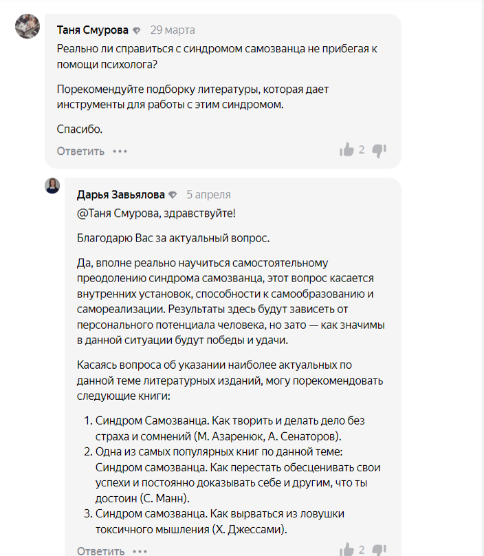 Один из участников попросил список литературы, которая поможет справиться с проблемой. Дарья Владимировна порекомендовала три книги, одна из которых: